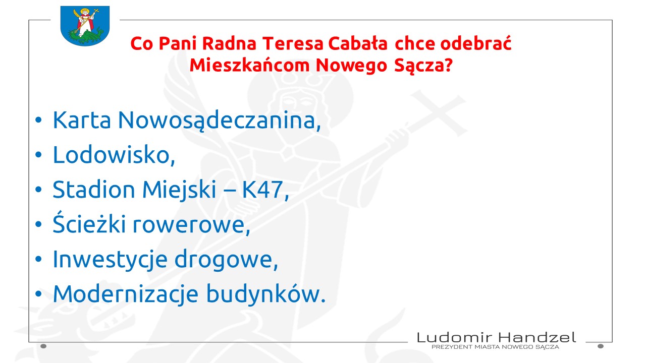 - Zostałem zaskoczony tym wnioskiem. Trudno uwierzyć, że coś takiego można wymyśleć. Wydaje się to całkowicie niezrozumiałe. W skrócie jest to odebranie mieszkańcom Karty Nowosądeczanina, blokady budowy lodowiska, stadionu i wielu innych rzeczy – dodał prezydent.