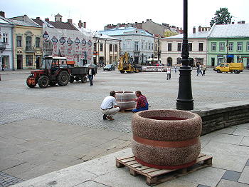 W Rynku pojawiły się nowe, kolorystycznie nawiązujące do fontanny i cokołu papieskiego pomnika. Dyrektor Wydziału Gospodarki Komunalnej i Ochrony Środowiska – Zbigniew Dmochowski wylicza, ze nowych donic będzie 46. Podłużne będą umieszczone wokół płyty Rynku – jest ich 42 sztuki.