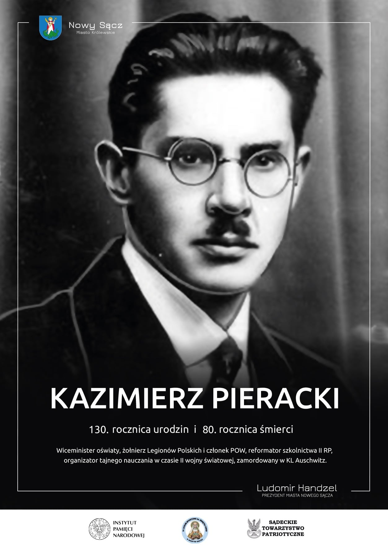 Kazimierz Pieracki pochodził ze znamienitego sądeckiego rodu, który zasłużył się w walkach o niepodległość Rzeczypospolitej. Kazimierz Pieracki był żołnierzem Legionów Polskich, członkiem Polskiej Organizacji Wojskowej oraz Związku Walki Czynnej. Pełnił funkcję wiceministra Wyznań Religijnych i Oświecenia Publicznego, będąc głównym architektem reformy szkolnictwa w okresie II RP. W czasie drugiej wojny światowej niestrudzenie walczył o wolność, organizując tajne nauczanie. Przewodził konspiracyjnej Komisji Oświecenia Publicznego. Za tę działalność został aresztowany i zamordowany w 21 lutego 1941 roku w niemieckim KL Auschwitz.