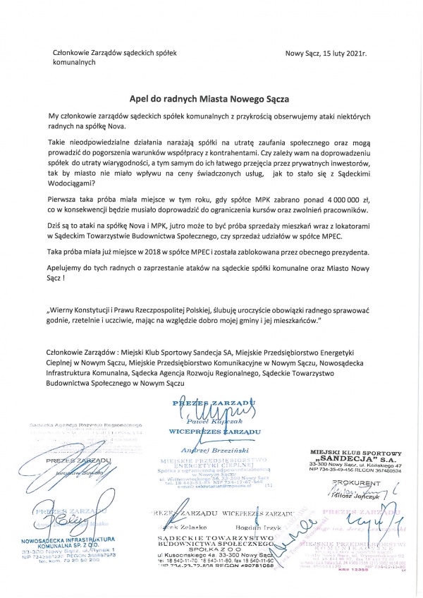 - Radnym oraz zarządowi Spółki NOVA nie przedstawiono protokołu kontroli. Pod znakiem zapytania stoi również bezstronność i wiarygodność dyrektor nowosądeckiej delegatury WIOŚ. Kontrole Straży Pożarnej oraz Nadzoru Budowlanego w Spółce NOVA nie wykazały żadnych uchybień. Nie możemy pozwolić, by miasto straciło kontrolę nad kolejną spółką – powiedział prezydent Ludomir Handzel.