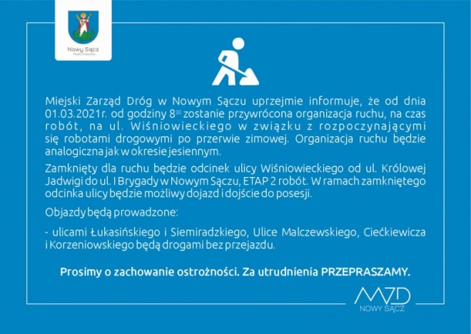 Miejski Zarząd Dróg w Nowym Sączu uprzejmie informuje, że od dnia 01.03.2021r. od godziny 8:00 zostanie przywrócona organizacja ruchu, na czas robót, na ul. Wiśniowieckiego w związku z rozpoczynającymi się robotami drogowymi po przerwie zimowej.