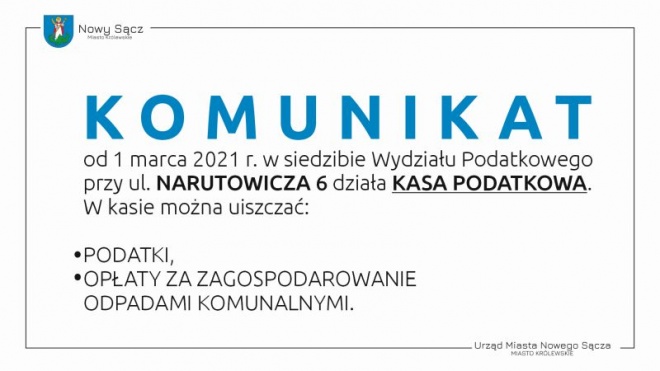 Od 1 marca 2021 r. w siedzibie Wydziału Podatkowego przy ul. Narutowicza 6 działa kasa podatkowa.