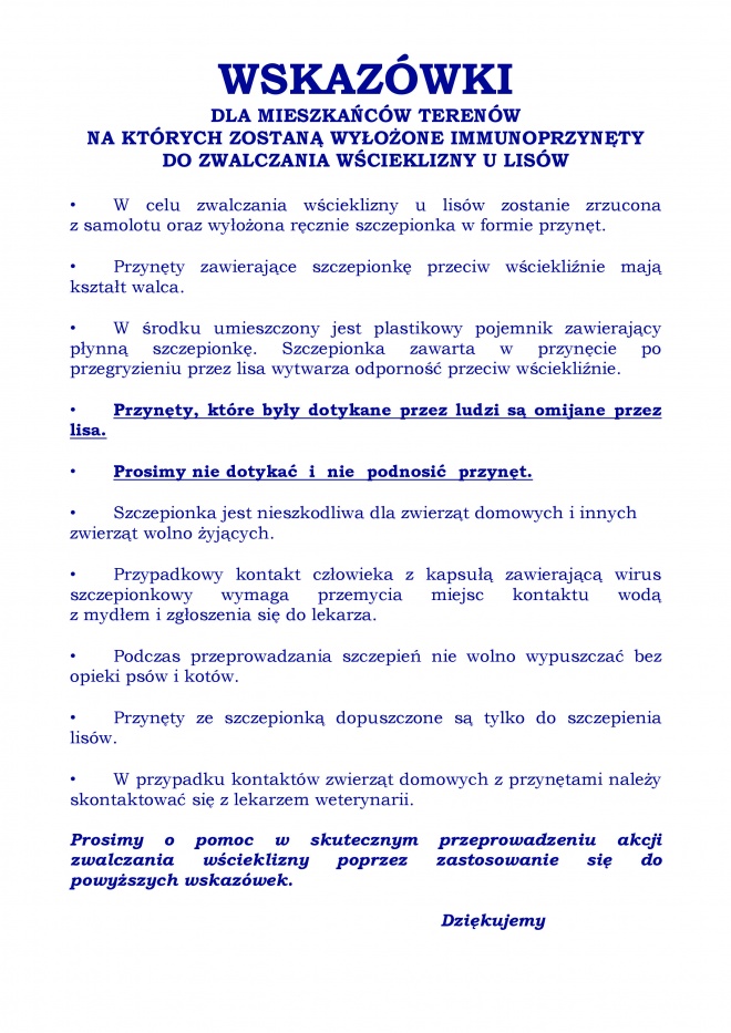 - nie dotykać, nie podnosić, a tym bardziej nie rozłamywać przynęty, gdyż znajdująca się wewnątrz szczepionka jest w stanie płynnym i może dostać się do organizmu poprzez skaleczenia na rękach, spojówkę oka lub błonę śluzową jamy ustnej i nosa.