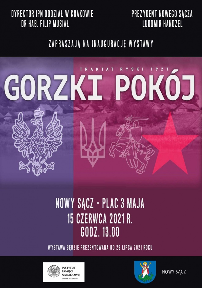 Prezydent Ludomir Handzel zaprasza na uroczyste otwarcie wystawy „Gorzki pokój. Traktat ryski 1921 r.” - wtorek 15 czerwca o godzinie 13.00 – Plac 3 maja. Gościć będziemy autora wystawy Dyrektora Biura Edukacji Narodowej IPN w Warszawie dr Adama Hlebowicza oraz dyrektora Oddziału IPN w Krakowie dr hab. Filipa Musiała.