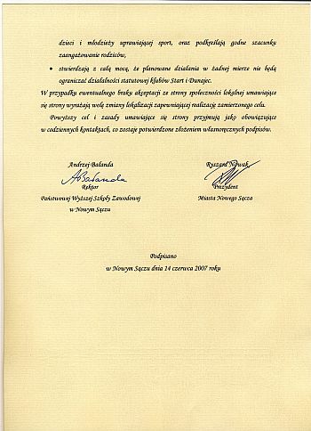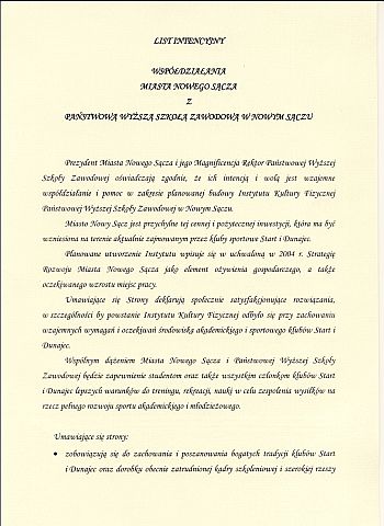 Prezydent Miasta Nowego Sącza Ryszard Nowak i Rektor Państwowej Wyższej Szkoły Zawodowej Andrzej Bałanda podpisali list intencyjny dotyczący współpracy Miasta Nowego Sącza z Państwową Wyższą Szkołą Zawodową w Nowym Sączu. Obie strony zapewniają, iż ich intencją i wolą jest wzajemne współdziałanie i pomoc w zakresie planowanej budowy Instytutu Kultury Fizycznej Państwowej Wyższej Szkoły Zawodowej w Nowym Sączu.