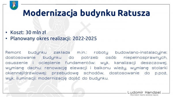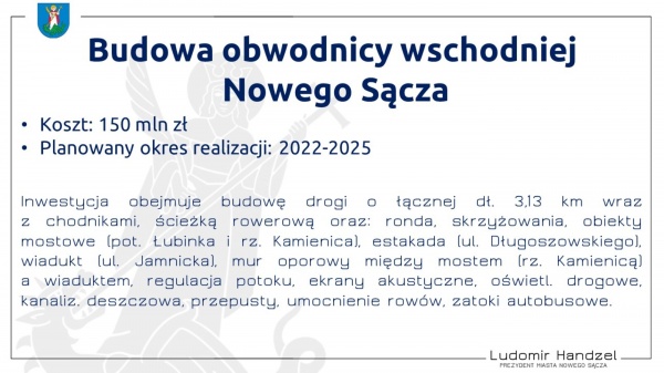 Podczas konferencji prasowej prezydent Ludomir Handzel, przedstawił inwestycje, dla których Urząd Miasta będzie wnioskował o dofinansowanie z programu Polski Ład. Są to: budowa obwodnicy wschodniej Nowego Sącza, modernizacja budynku Ratusza, budowa boiska ze sztuczną murawą (Zawada). Wnioski zostaną złożone do końca tego miesiąca.
