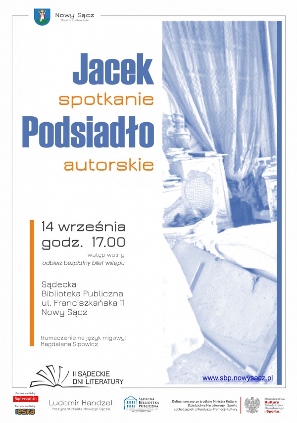 Spotkanie z poetą odbędzie się w ramach II Sądeckich Dni Literatury, zadania dofinansowanego ze środków Ministra Kultury, Dziedzictwa Narodowego i Sportu pochodzących z Funduszu Promocji Kultury.