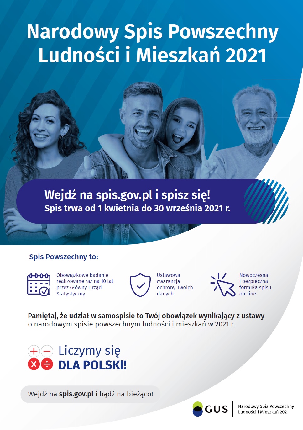 Na terenie całego kraju Główny Urząd Statystyczny prowadzi Narodowy Spis Powszechny Ludności i Mieszkań, który potrwa tylko do 30 września 2021 roku. Obowiązkową i najwygodniejszą metodą udziału w spisie jest samospis internetowy – na stronie internetowej spis.gov.pl należy zalogować się do aplikacji i wypełnić formularz spisowy. Spisać się można także przez infolinię pod numerem telefonu (22) 279 99 99.