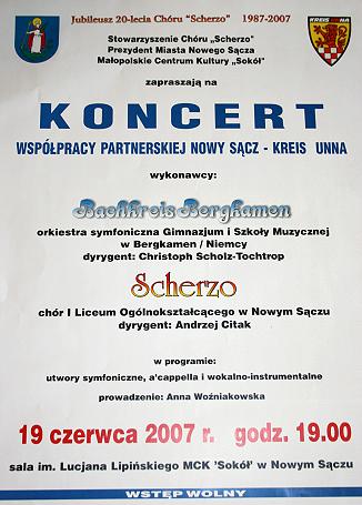 Obecne spotkanie odbędzie się w dniach 16-21 czerwca. Młodzieżowa orkiestra „Bachkreis” Gimnazjum i Szkoły Muzycznej w Bergkamen, została zaproszona do Nowego Sącza w ramach obchodów 20-lecia działalności chóru "Scherzo", nad którym honorowy patronat objęli: Prezydent Miasta Nowego