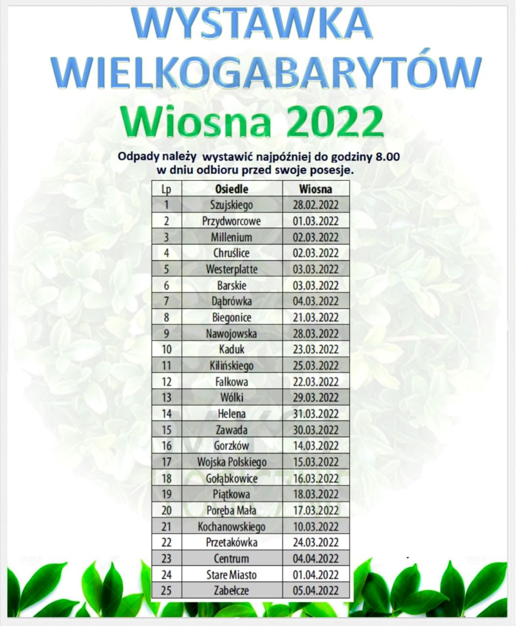 Informujemy, iż od 28 lutego br. rozpoczynamy zbiórkę odpadów wielkogabarytowych, opon oraz zużytego sprzętu elektrycznego i elektronicznego. Odpady należy wystawić najpóźniej do godziny 8.00 w dniu odbioru przed swoje posesje.