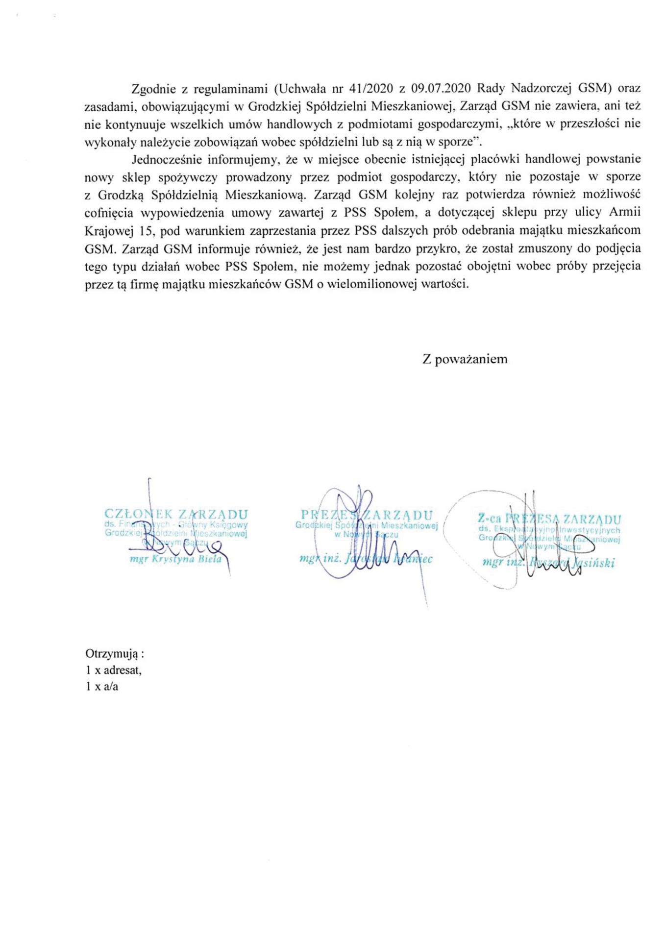 - Wyjaśnienia, które otrzymałem od Zarządu Grodzkiej Spółdzielni Mieszkaniowej są jasne i klarowne. Zarząd SPOŁEM podjął działania zmierzające do przejęcia własności GSM i jest w sporze sądowym ze spółdzielnią mieszkaniową. Zgodnie z przepisami wewnętrznymi spółdzielni taka współpraca nie może być kontynuowana. Dziękuję Zarządowi GSM za wyjaśnienie tematu, obronę interesów członków Grodzkiej Spółdzielni Mieszkaniowej, a także za decyzję, iż w miejscu dotychczasowej placówki SPOŁEM pojawi się także sklep spożywczy. Szczegółowe wyjaśnienia w piśmie Zarządu GSM - mówi prezydent Ludomir Handzel.