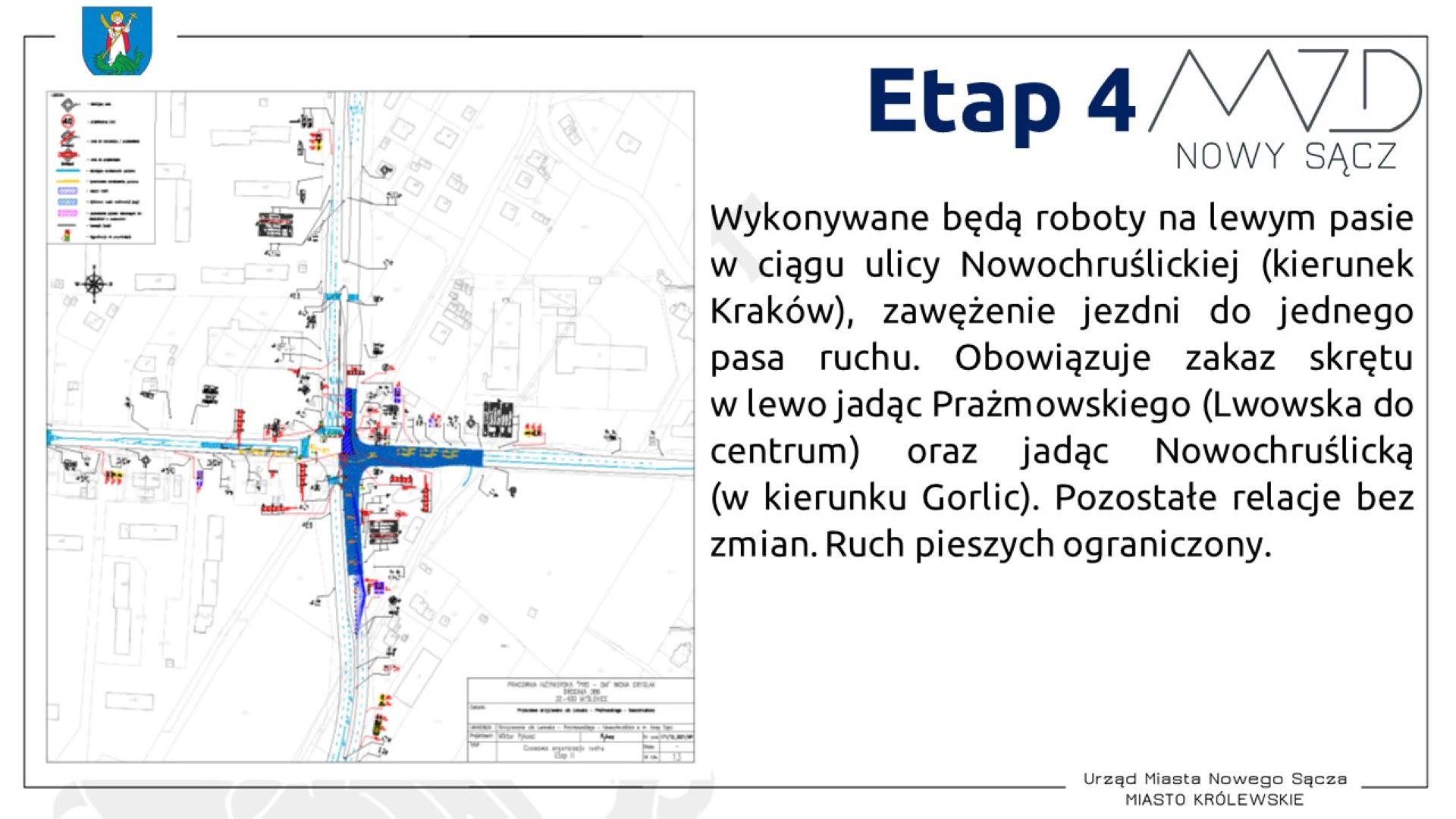 Miejski Zarząd Dróg w Nowym Sączu informuje, że od środy (27 kwietnia) od godz. 8:00 rozpocznie się IV etap modernizacji skrzyżowania ulic Lwowska - Prażmowskiego - Nowochruślicka. Za utrudnienia przepraszamy i apelujemy o bezpieczną jazdę.