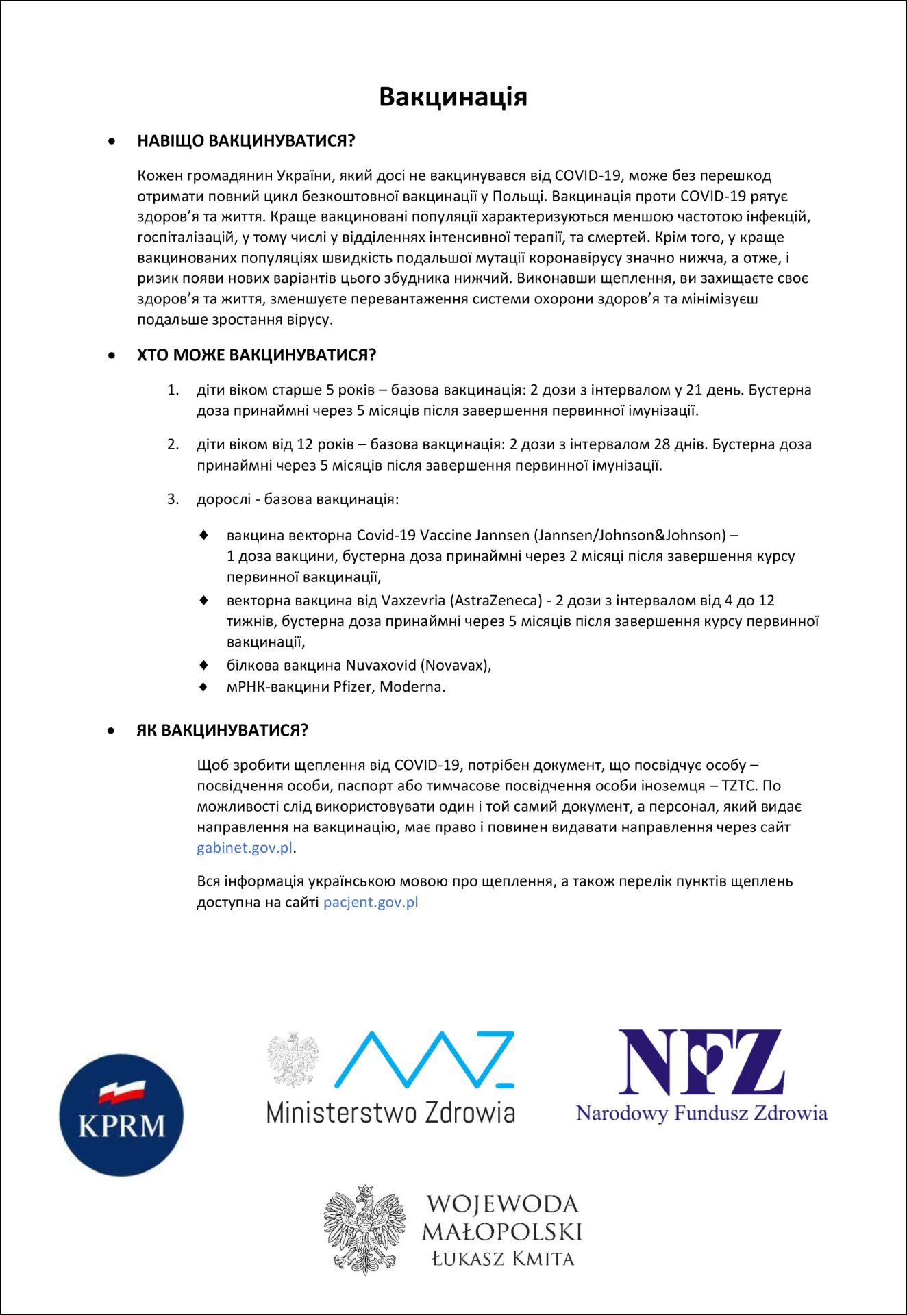 Wszelkie informacje w języku ukraińskim, dotyczące szczepień wraz z wykazem punktów szczepień są dostępne na stronie internetowej www.pacjent.gov.pl.