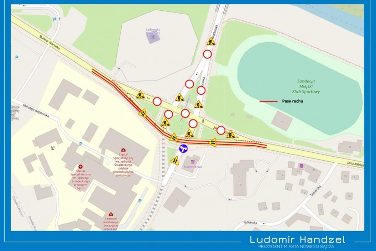 Miejski Zarząd Dróg w Nowym Sączu informuje, że od wtorku (31 maja) od godziny 7.30 zostanie wprowadzona zmiana organizacji ruchu na skrzyżowaniu ulic Młyńskiej – Kilińskiego – Krańcowej - Bulwar Narwiku (rondo pod szpitalem).