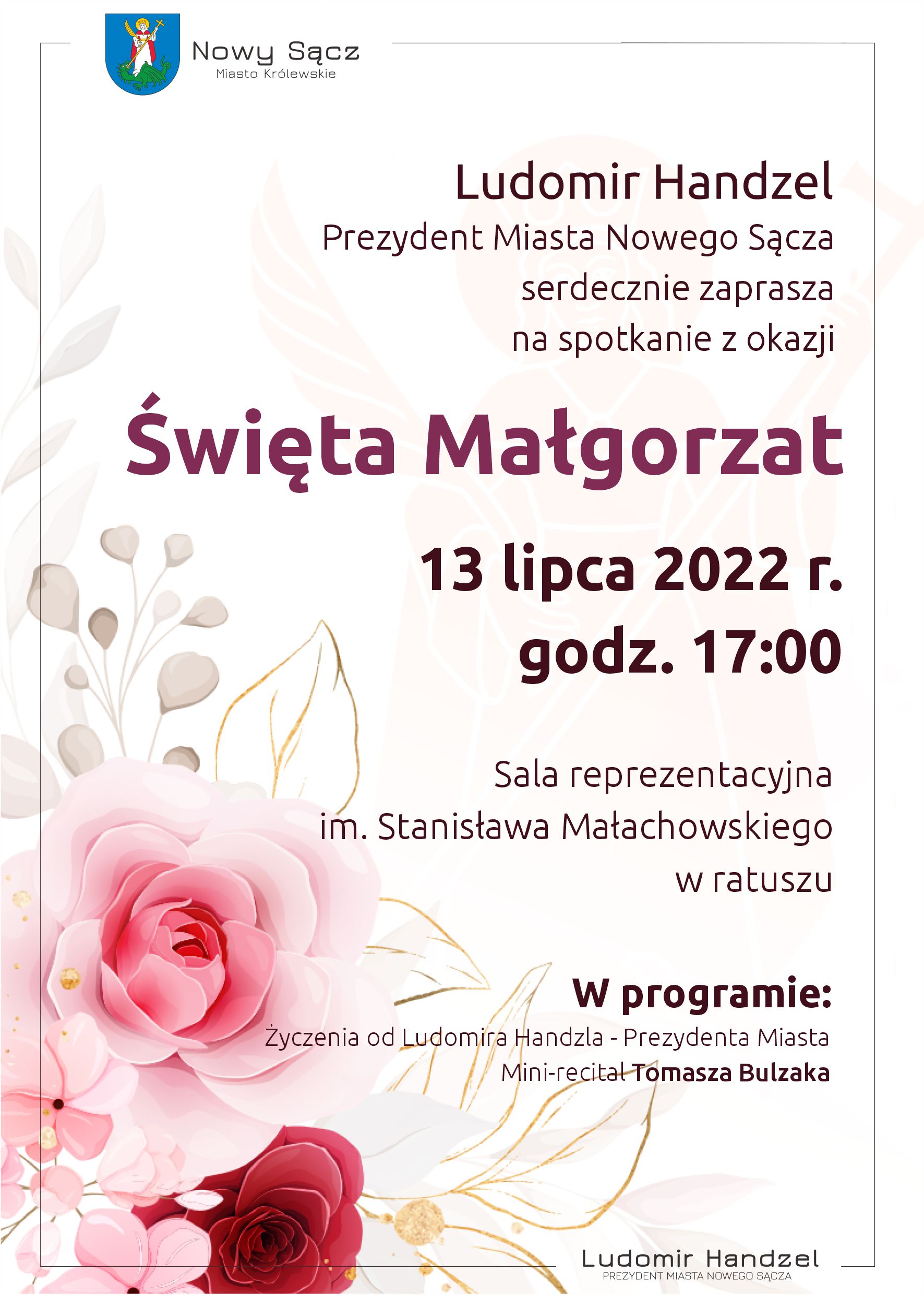 Ludomir Handzel – Prezydent Miasta Nowego Sącza serdecznie zaprasza wszystkie Małgorzaty na spotkanie z okazji ich Święta w dn.13 lipca 2022 r. o godz. 17:00 w sali reprezentacyjnej im. Stanisława Małachowskiego w ratuszu.
