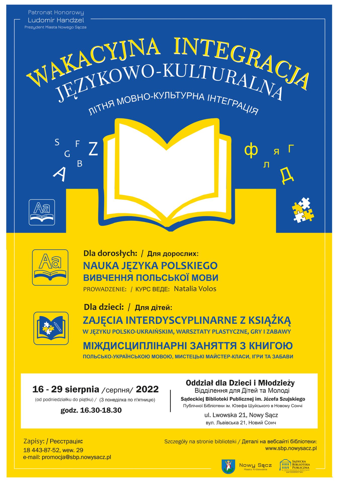 Sądecka Biblioteka Publiczna im. Józefa Szujskiego zaprasza rodziny ukraińskie - zarówno dorosłych jak i dzieci, do uczestnictwa w wakacyjnej integracji językowo-kulturalnej. Wydarzenie Patronatem Honorowym objął Prezydent Miasta Nowego Sącza Ludomir Handzel.