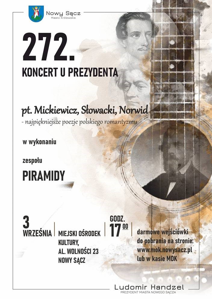Ludomir Handzel - Prezydent Miasta Nowego Sącza zaprasza na 272. koncert u Prezydenta pt. „Mickiewicz, Słowacki, Norwid - najpiękniejsze poezje polskiego romantyzmu” w wykonaniu zespołu Piramidy, który odbędzie się 3 września 2022 r. o godz. 17:00 w Miejskim Ośrodku Kultury w Nowym Sączu, w ramach obchodów Roku Romantyzmu Polskiego.