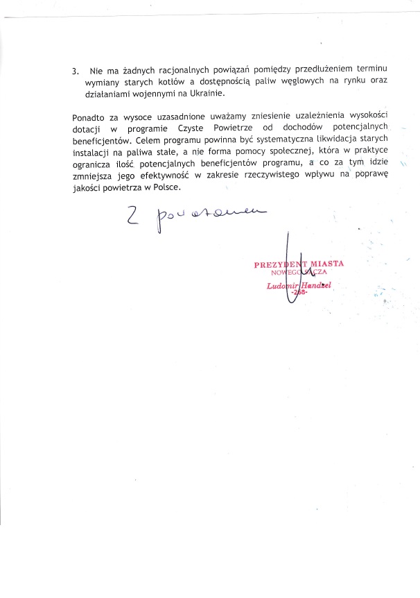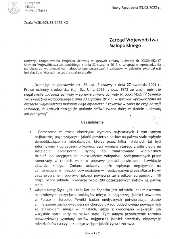 - Działając na podstawie art. 96 ust. 2 ustawy z dnia 27 kwietnia 2001 r. Prawo ochrony środowiska (t.j. Dz. U. z 2021 r. poz. 1973 ze zm.) opiniuje negatywnie „Projekt uchwały w sprawie zmiany uchwały Nr XXXII/452/17 Sejmiku Województwa Małopolskiego z dnia 23 stycznia 2017 r. w sprawie wprowadzenia na obszarze województwa małopolskiego ograniczeń i zakazów w zakresie eksploatacji instalacji, w których następuje spalanie paliw” zwana dalej w skrócie „uchwałą antysmogową” – podkreślił prezydent Ludomir Handzel. – Przedłużenie terminu obowiązującej wymiany kotłów najgorszej jakości przedłuży ekspozycję mieszkańców na czynniki pogarszające jakość życia i zdrowia – dodał.