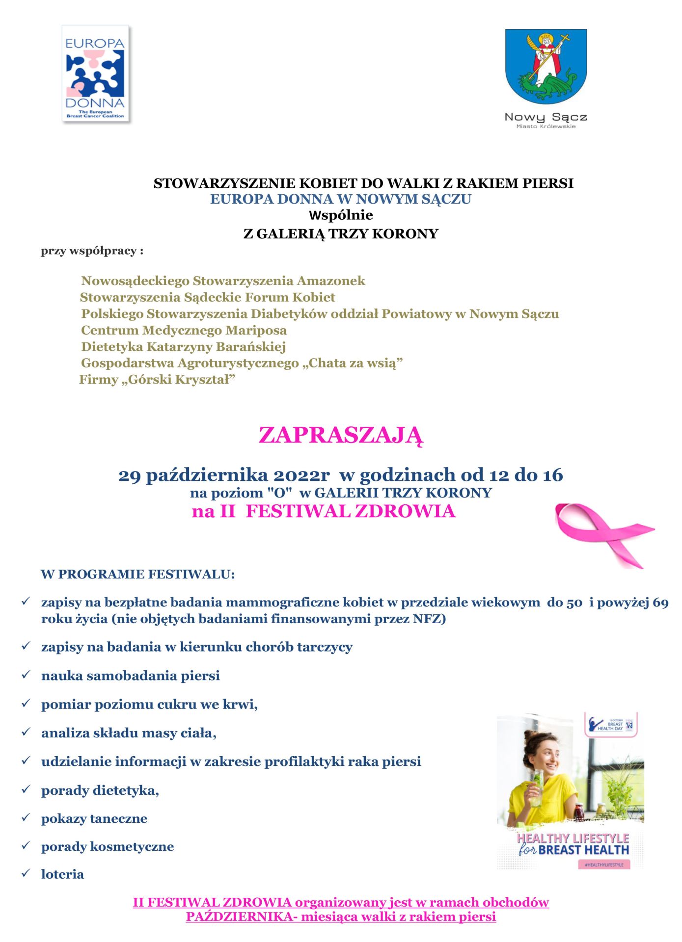 Stowarzyszenie kobiet do walki z rakiem piersi EUROPA DONNA W NOWYM SĄCZU wspólnie z GALERIĄ TRZY KORONY zapraszają 29 Października 2022 r. w godzinach od 12 do 16 na poziom "0" w GALERI TRZY KORONY na II FESTIWAL ZDROWIA.