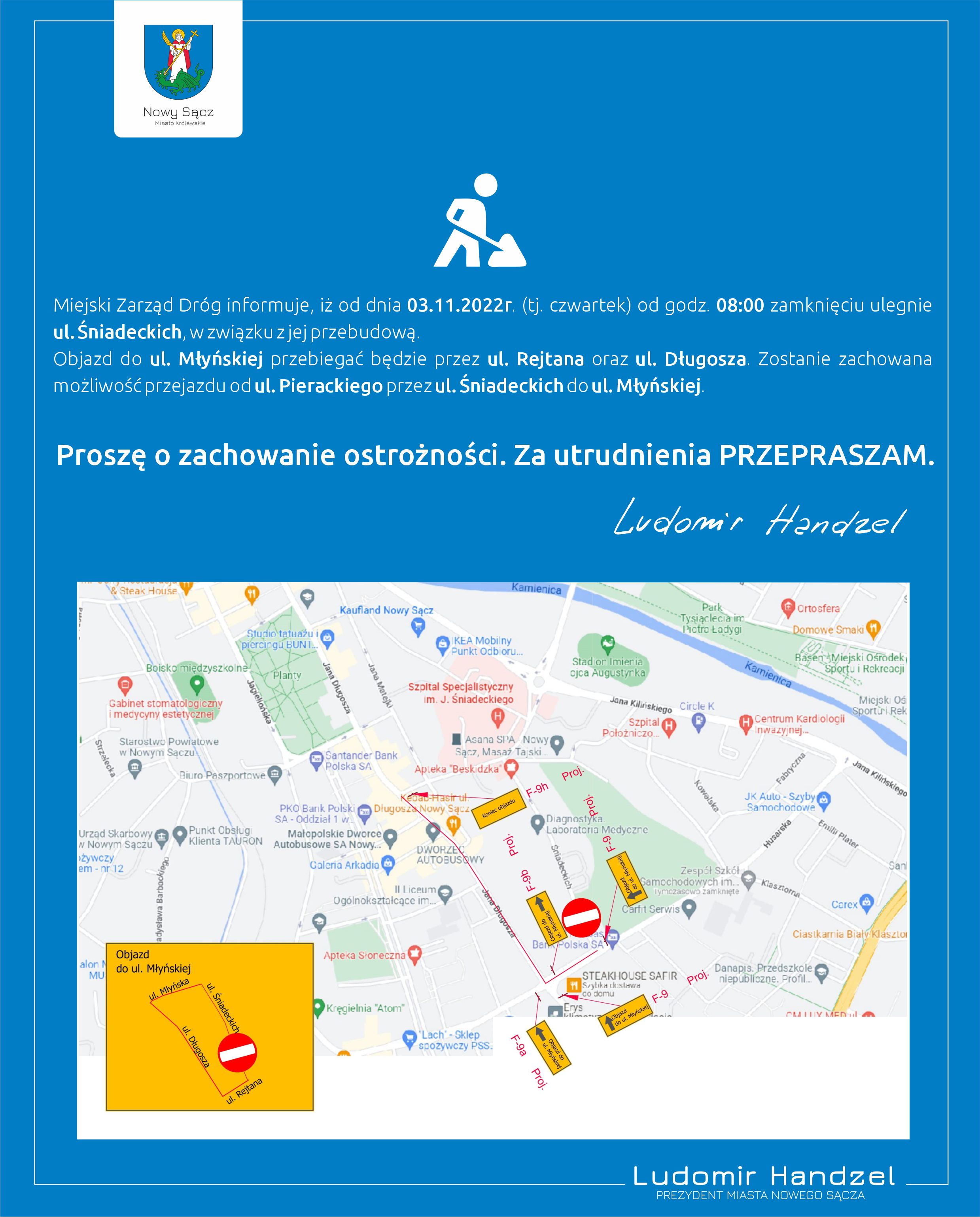 Miejski Zarząd Dróg informuje, iż od dnia 03.11.2022r. (tj. czwartek) od godz. 08:00 zamknięciu ulegnie ul. Śniadeckich, w związku z jej przebudową. Objazd do ul. Młyńskiej przebiegać będzie przez ul. Rejtana oraz ul. Długosza. Zostanie zachowana możliwość przejazdu od ul. Pierackiego przez ul. Śniadeckich do ul. Młyńskiej.