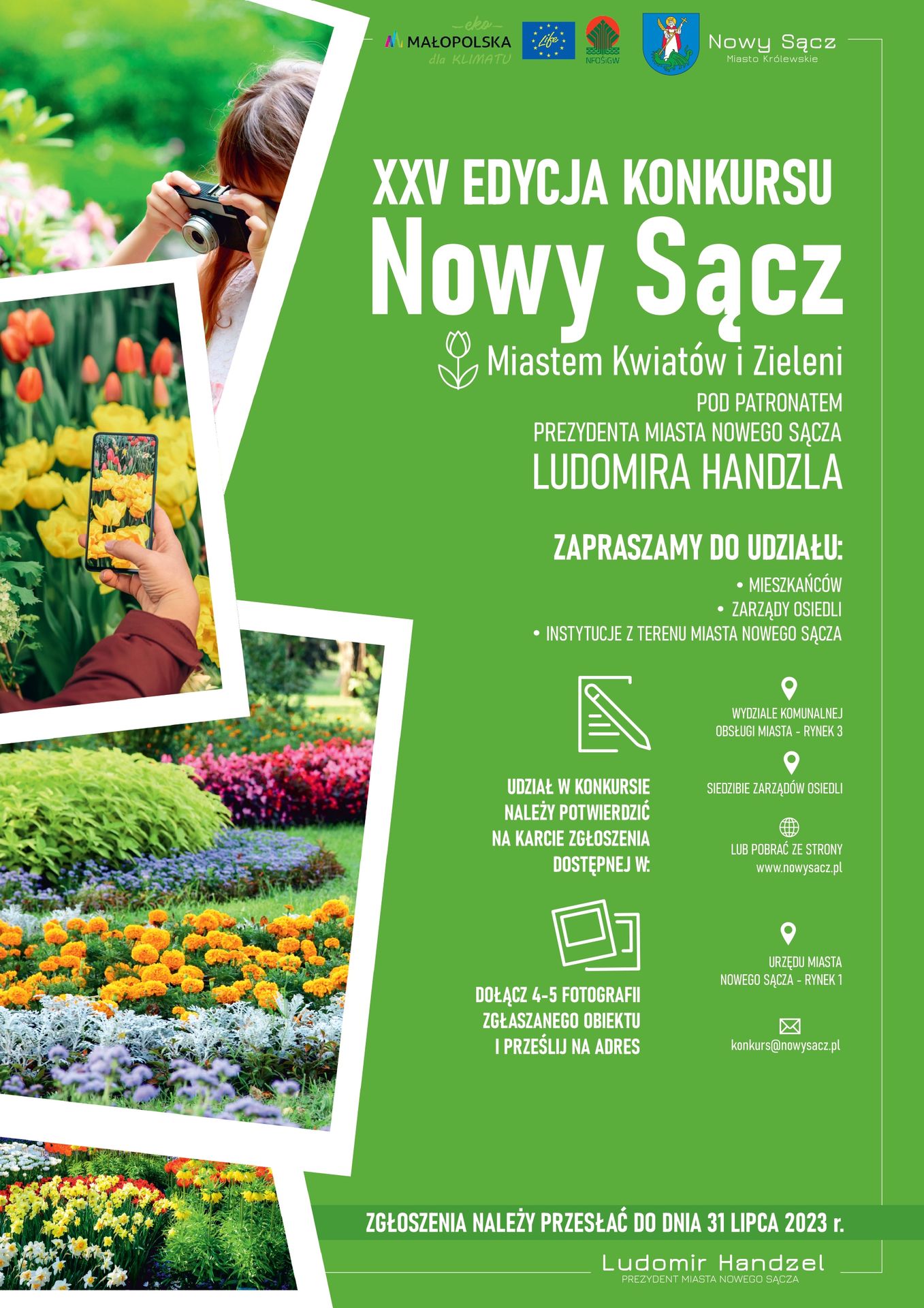 Prezydent Ludomir Handzel zaprasza do udziału w 25 edycji Konkursu Nowy Sącz Miastem Kwiatów i Zieleni. Założeniem konkursu jest powrót do tradycji – "Nowy Sącz – Miastem Kwiatów i Zieleni", podniesienie stanu estetycznego miasta, podniesienie poczucia współodpowiedzialności za wygląd estetyczny, właściwe zagospodarowanie i czystość otoczenia oraz pobudzenie aktywności i inicjatyw mieszkańców w dbałości o środowisko naturalne oraz tworzenie nowego wizerunku miasta.