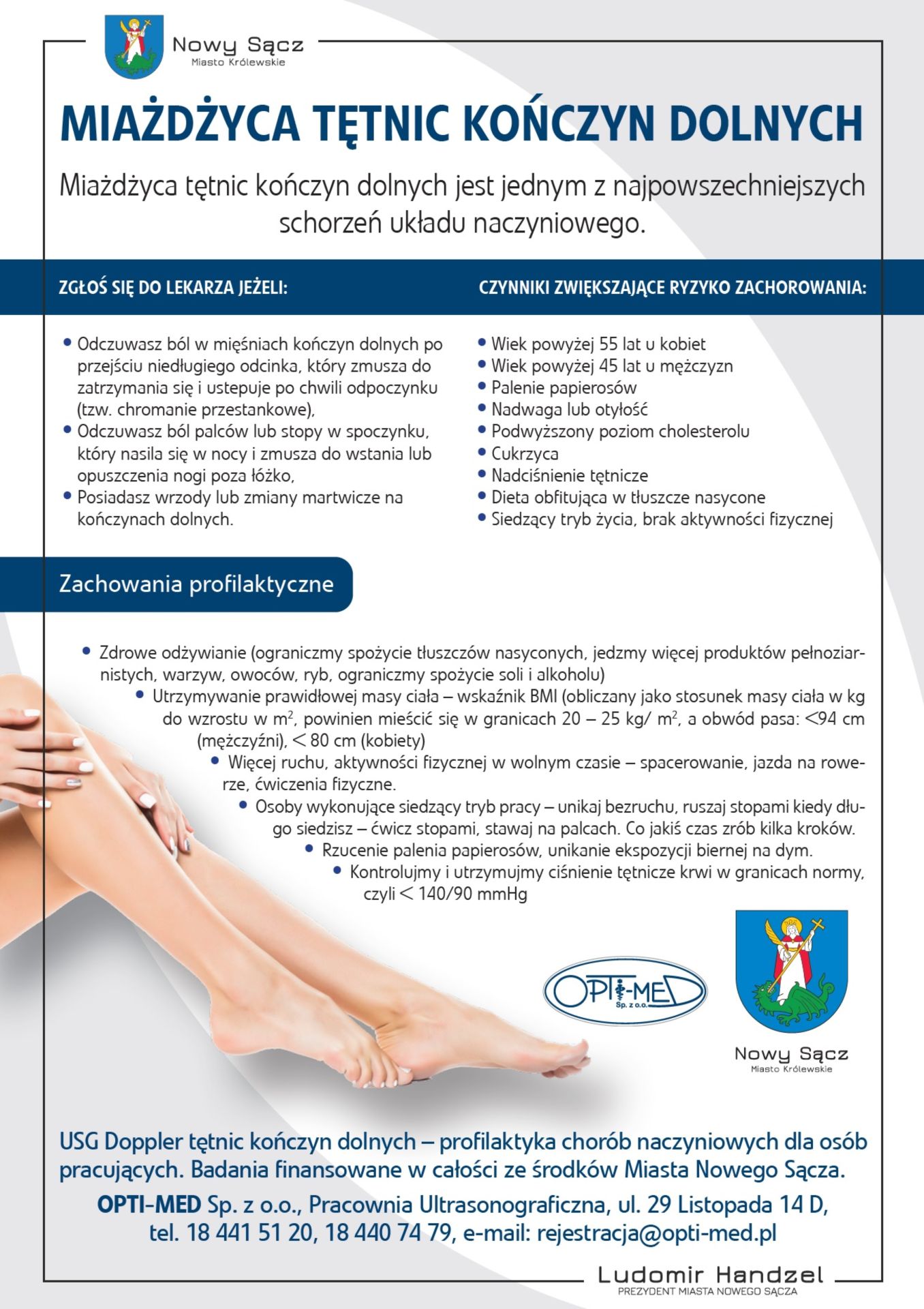 Prezydent Miasta Nowego Sącza Ludomir Handzel zaprasza aktywnych zawodowo mieszkańców Nowego Sącza w wieku od 40 roku życia lub młodsze osoby z grupy ryzyka (czynniki genetyczne) do udziału w bezpłatnym badaniu profilaktycznym USG Doppler tętnic kończyn dolnych.