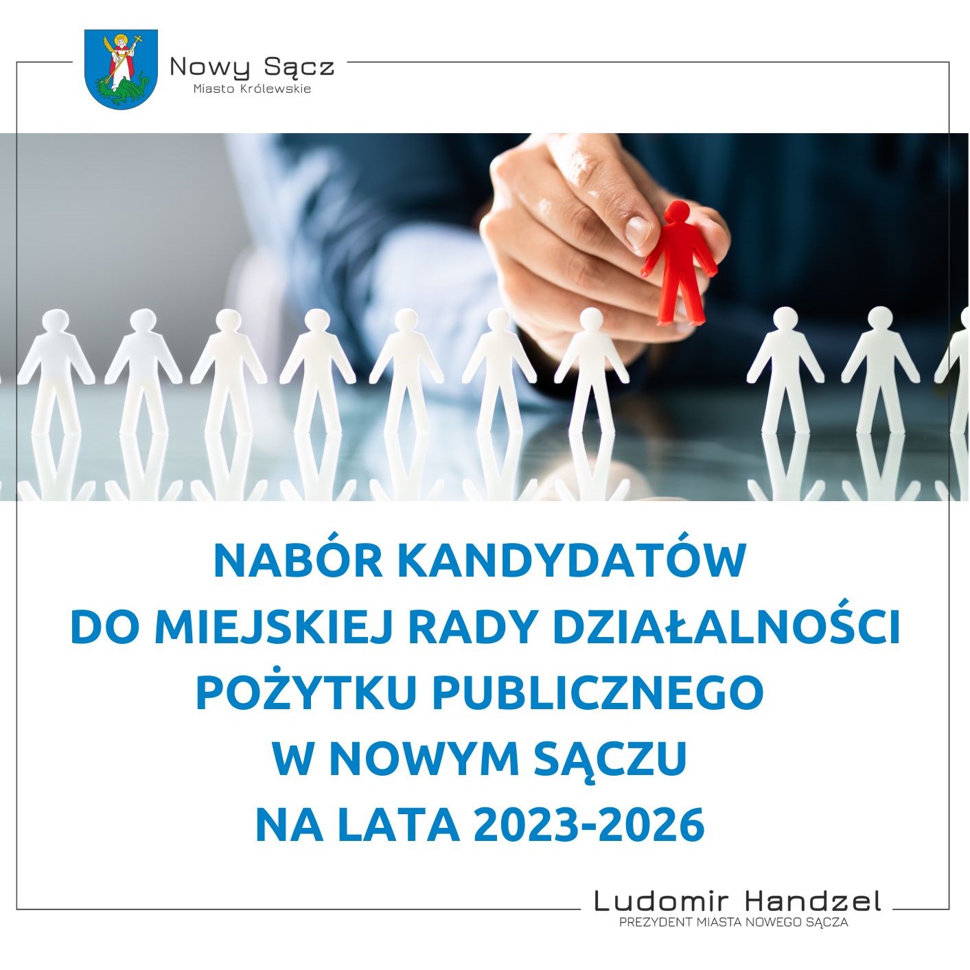 Prezydent Miasta Nowego Sącza zaprasza organizacje pozarządowe oraz podmioty wymienione w art. 3 ust. 3 ustawy z dnia 24 kwietnia 2003 r. o działalności pożytku publicznego i o wolontariacie, działające na terenie Nowego Sącza do zgłaszania kandydatek i kandydatów do Miejskiej Rady Działalności Pożytku Publicznego w Nowym Sączu na lata 2023- 2026.