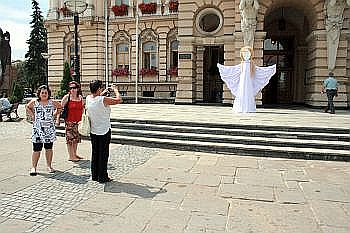 Anioł, w długiej białej sukni z białymi skrzydłami i długich, jasnych włosach oraz pogodnej twarzy stoi na płycie sądeckiego rynku. Anioł zapowiada wielki „Sądecki Jarmark Anielski”, który odbędzie się już w najbliższą sobotę i niedzielę. Trzy metrowa postać wzbudza powszechny zachwyt, mieszkańcy jak i turyści fotografują się razem z anielską postacią.