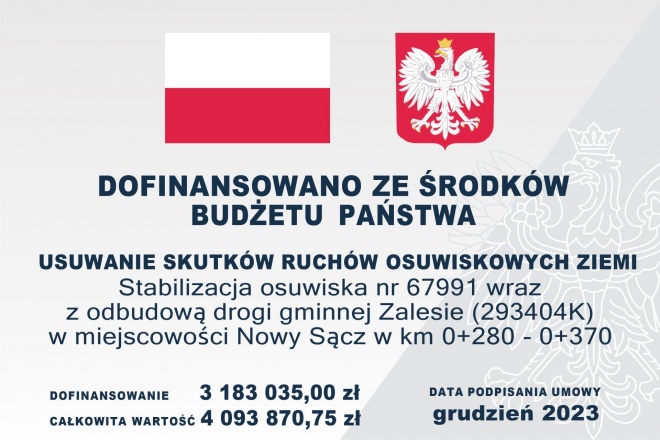 Miasto Nowy Sącz otrzymało dotację w wysokości 3 183 035,00 zł z rezerwy celowej budżetu państwa na usuwanie skutków ruchów osuwiskowych ziemi, na realizację zadania pn. „Wykonanie właściwych prac w ramach zadania pn. Stabilizacja osuwiska nr 67991 wraz z odbudową drogi gminnej Zalesie (293404K) w miejscowości Nowy Sącz w km 0+280 – 0+370”.