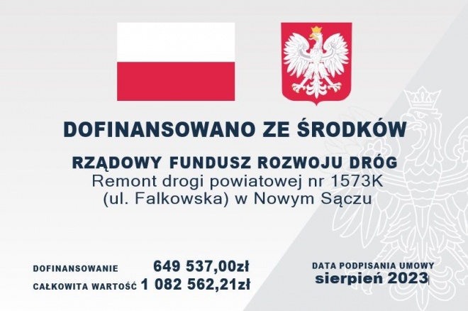 Remont drogi powiatowej 1573K (ul. Falkowska) w km od 02+293,00 do km 03+487,00 w miejscowości Nowy Sącz, Miasto Nowy Sącz. Dofinansowano ze środków: Rządowy Fundusz Rozwoju Dróg. Dofinansowanie 649 537,00 zł, całkowita Wartość:1 082 562,21, data podpisania umowy: sierpień 2023.