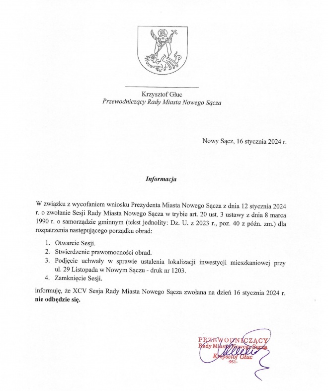 Krzysztof Głuc, przewodniczący Rady Miasta Nowego Sącza informuje, że sesja zaplanowana na 16 stycznia została odwołana.