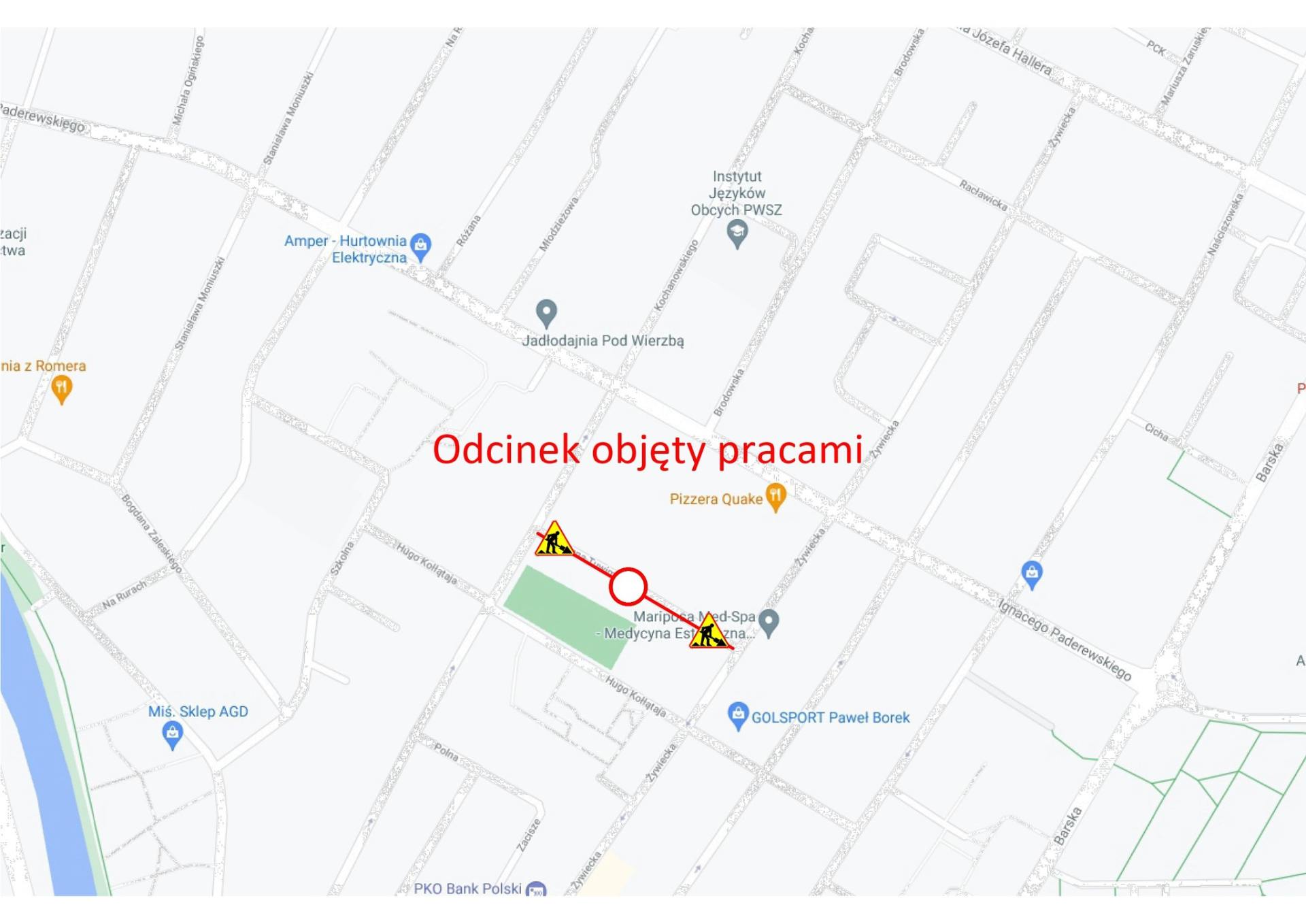 Jednocześnie rozpoczną się roboty związane z wykonaniem nawierzchni asfaltowej na ul. Tłoki, na odcinku wskazanym na mapie.