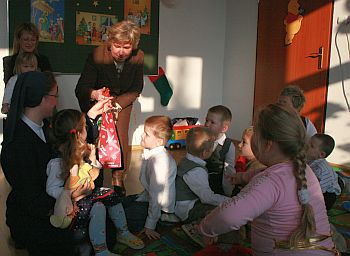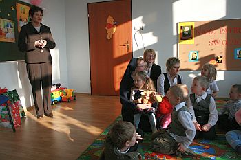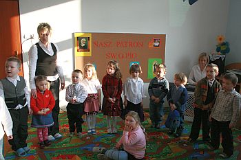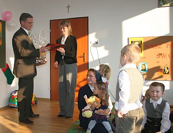 Życzenia i gratulacje przekazała również wiceprezydent Bożena Jawor, która wyraziła nadzieję, że w roku następnym w przedszkolu katolickim funkcjonować będą dwa oddziały. Przedszkolakom podarowała słodki upominek.