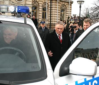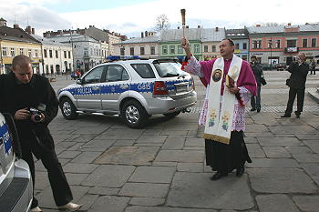 W trakcie uroczystego spotkania - ksiądz prałat Andrzej Jeż poświęcił nowe radiowozy, które dla policji zakupili samorządowcy z gmin: Nawojowa, Łabowa, Kamionka Wielka.