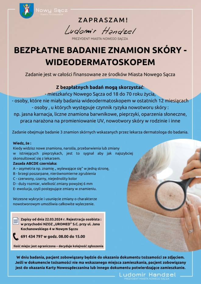 Prezydent Ludomir Handzel zaprasza mieszkańców Nowego Sącza do udziału w bezpłatnym badania znamion skóry.
