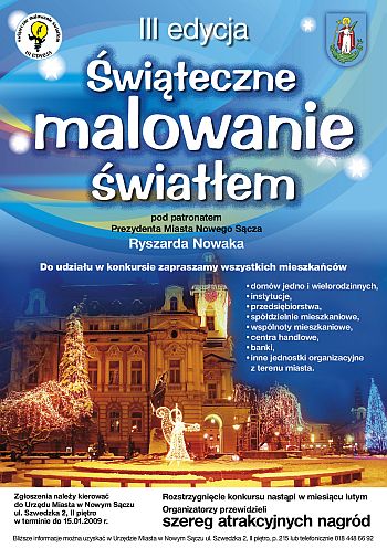 Do 15 stycznia przyjmowane są zgłoszenia do udziału w konkursie "Świąteczne Malowanie Światłem". Głównym celem jest wyłonienie najładniejszej iluminacji świątecznej oraz propagowanie estetycznego wyglądu obiektów, budynków i miejsc w mieście nadających miastu wyjątkowy klimat oraz zwiększenie atrakcyjności miasta dla mieszkańców i turystów, rozwój turystyki, handlu i więzi międzyludzkich. Do konkursu mogą być zgłoszone obiekty będące własnością miasta, prywatni właściciele domów jedno i wielorodzinnych, instytucje, przedsiębiorstwa, spółdzielnie mieszkaniowe, wspólnoty mieszkaniowe, centra handlowe, banki, inne jednostki organizacyjne z terenu miasta którzy zgłoszą swoje uczestnictwo pisemnie lub telefonicznie w konkursie. Główną nagrodą jest uzyskanie tytułu „Najładniejszej Iluminacji Świątecznej” w roku 2008. Patronat medialny sprawują wszystkie lokalne redakcje, które ogłaszają konkurs na nagrodę publiczności /pokazując zdjęcia iluminacji świątecznych wraz z kuponem konkursowym który będzie wypełniony i przesyłany do redakcji/.