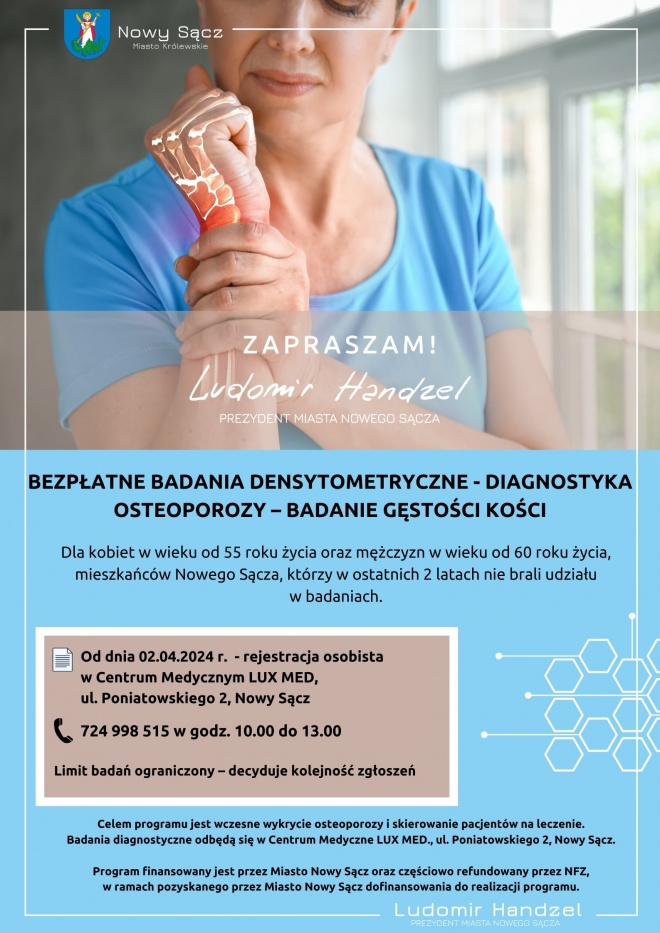 Prezydent Ludomir Handzel zaprasza mieszkańców Nowego Sącza na badania densytometryczne czyli badanie gęstości kości.