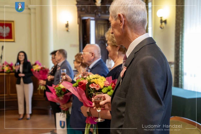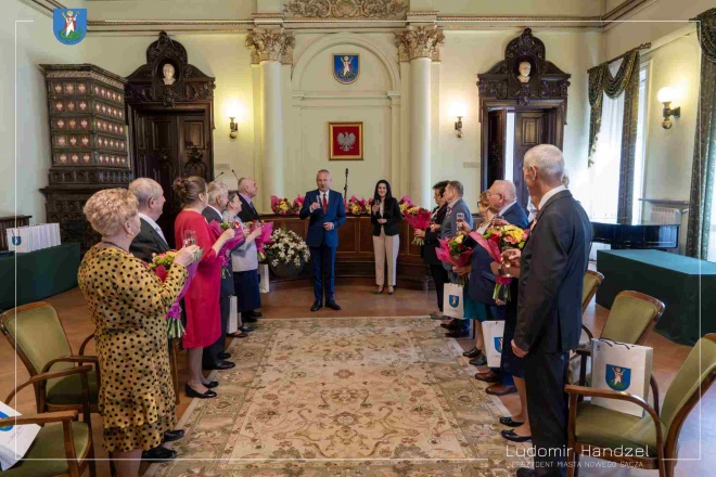Prezydent Ludomir Handzel złożył gratulację i życzenia 13 parom, które świętowały w nowosądeckim ratuszu jubileusz złotych godów