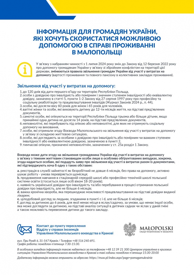 W związku z wejściem w życie w dniu 1 lipca 2024 roku zmian w ustawie odnośnie pomocy obywatelom Ukrainy, ulegają zmianie zasady zwolnienia obywateli Ukrainy z partycypacji w kosztach pomocy.