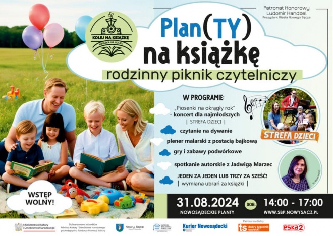 „Plan(TY) na książkę” to rodzinny piknik czytelniczy w ramach którego odbędą się: koncert dla najmłodszych w wykonaniu Strefy Dzieci, spotkanie autorskie, plener malarski z postacią bajkową, gry i zabawy podwórkowe, czytanie na dywanie, wymiana książek na ubrania, konkursy i animacje.
