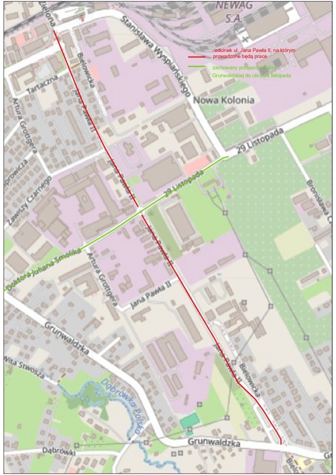 - od ronda biszkoptowego na skrzyżowaniu z ulicami Zieloną i Wyspiańskiego do nowo wybudowanego ronda na odcinku łączącym ul. Smolika z ul. 29 Listopada