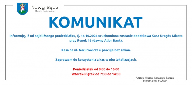 Urząd Miasta Nowego Sącza informuje, że od 14 października (poniedziałek) zostanie uruchomiona dodatkowa kasa urzędu. Będzie się ona mieścić przy ul. Rynek 16 (dawny Alior Bank).