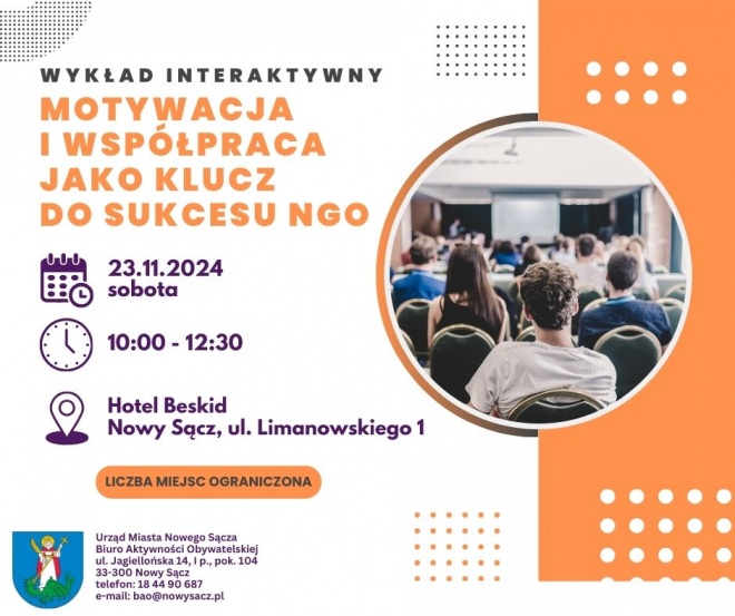 W ramach wydarzenia odbędzie się wykład interaktywny pt. Motywacja i współpraca jako klucz do sukcesu NGO, który poprowadzi Anna Kopczyk - posiadająca doświadczenie w szkoleniach z obsługi klienta, motywacji zespołów i udzielania informacji zwrotnej, od lat współpracuje z fundacjami i stowarzyszeniami. Jest aktywną wolontariuszką Fundacji K.I.D.S., a w swojej pracy chętnie wykorzystuje mapy myśli, pomagając organizacjom pozarządowym w znajdowaniu nowych rozwiązań.