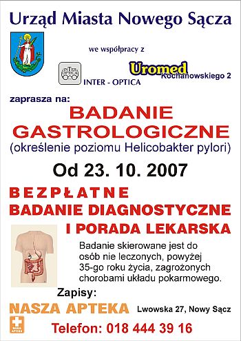 Badania przesiewowe, polegające na oznaczeniu obecności i poziomu Helicobakter Pylori wraz z poradą gastrologiczną adresowane są do 300 osób – Mieszkańców Nowego Sącza powyżej 35 roku życia, które nie miały dotąd zdiagnozowanej obecności HP.