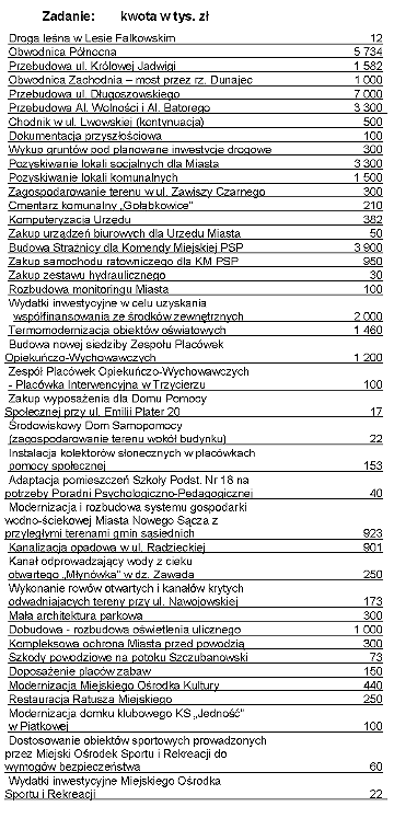 Wydatki majątkowe projektu budżetu miasta na 2009 rok zamykają się kwotą 40 183 187 zł i obejmują następujące zadania :