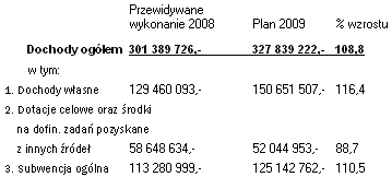 Podstawą ustalenia wielkości planowanych dochodów przedstawionych w projekcie budżetu miasta na 2009 rok jest przewidywane wykonanie dochodów za 2008 rok, jak również otrzymane informacje o wysokościach dotacji celowych z budżetu państwa na realizację zadań zleconych i własnych, realizowanych przez miasto (gminę) i powiat, informacje o wysokościach subwencji na zadania miasta i powiatu oraz informacje o wysokości planowanych wpływów z udziału w podatku dochodowym od osób fizycznych dla miasta i powiatu.