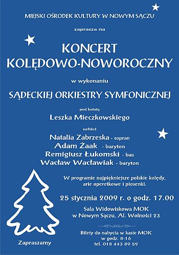 W najbliższą niedzielę 25 stycznia 2008 r. w Sali Widowiskowej MOK w Nowym Sączu odbędzie się koncert kolędowo - noworoczny. Wystąpi Sądecka Orkiestra Symfoniczna pod dyrekcją Leszka Mieczkowskiego oraz soliści: Natalia Zabrzeska, Adam Żaak, Remigiusz Łukomski, Wacław Wacławiak. W programie najpiękniejsze polskie kolędy, arie operetkowe i piosenki. Początek koncertu o godz. 17:00.