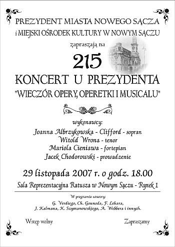 W czwartek 29 listopada 2007 r. odbędzie się kolejny 215 KONCERT U PREZYDENTA MIASTA NOWEGO SĄCZA – „Wieczór opery, operetki i musicalu”. Podczas koncertu wystąpią: Joanna Albrzykowska – Clifford – sopran, Witold Wrona - tenor i Mariola Cieniawa, która zagra na fortepianie. Koncert poprowadzi Jacek Chodorowski. W programie utwory Verdiego, Kalmana, Szymanowskiego, Webbera i innych kompozytorów. Początek koncertu, który będzie miał miejsce w Sali Ratuszowej - o godz. 18.oo.