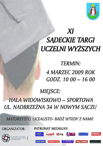 XI Sądeckie Targi Uczelni Wyższych odbędą się 4 marca 2009 r. w Hali Widowiskowo - Sportowej w Nowym Sączu przy ul. Nadbrzeżnej 34, w godzinach od 10.00 do 16.00.