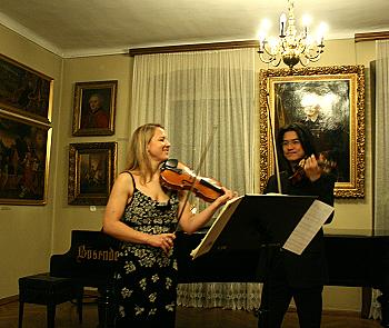 Następnie melomani usłyszeli wybrany skład duetów na dwoje skrzypiec Beli Bartoka. Tym razem wraz z Dominiką Rosiek wystąpił Khac-Uyen Nguyen – skrzypek i dyrygent, wychowanek Royal Academy of Music. Duety Bartoka, w których pobrzmiewają echa muzyki ludowej zostały przez muzyków zaprezentowane z dużą ekspresją i dynamiką, co spotkało się z uznaniem przybyłych na koncert słuchaczy. Pierwszą część koncertu zamknęły Introdukcja i Rondo Capriccioso – Camillle Saint-Saensa na skrzypce i fortepian. W drugiej części koncertu artyści wprowadzili publiczność w klimaty muzyki Sergeia Prokofieva i Edwarda Griega. Sonata na dwoje skrzypiec C-dur opus 56 – Sergeia Prokofieva, w wykonaniu królewskich muzyków ukazała piękno brzmień współczesnych, które często wykorzystywane są choćby w muzyce filmowej. Następnie Sonata c-moll opus 45 Edwarda Griega – zwanego Chopinem Północy, zabrzmiała pełnią harmonii charakterystycznej dla muzyki doby romantyzmu.